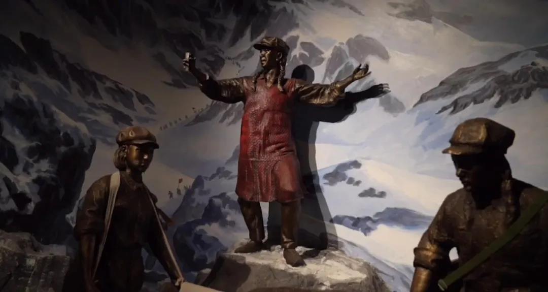 蔡畅、邓颖超、贺子珍、康克清、李坚真、刘英、李贞、刘伯钊……纪念馆的一面墙上,镌刻了4113个女红军的名字,而这些仅仅是女红军群体中的一部分,还有更多不知姓名、不知年龄的女红军战士,在战斗中英勇牺牲。馆内的另一面照片墙上,展示着数百位女红军的照片,她们中的在世者每离开一位,墙上的照片就由彩色变成黑白。数千名女红军战士,胸怀解放全天下劳苦人民的伟大理想,走上革命道路,以女性特有的坚韧肩负起革命的重担。她们是母亲,是妻子,是女儿,更是勇敢坚毅的革命战士。走进中国女红军纪念馆,也就走近了漫漫征途中的“她们”……在纪念馆里,有一座穿着红色毛衣的女红军雕塑,她是红军队伍里的一名卫生员。在翻雪山时,这位小战士身体单薄,同行的女战士将身上唯一一件红毛衣穿到她的身上。小姑娘开心地跑前跑后,打着快板把行进中的故事编成歌谣唱给大家听,在漫天风雪里给战士们送去欢笑和希望。她的红色身影活跃在寒冷的风雪中,像一团炽热的火,战士们亲切地喊她“小太阳”。在长征路上,很多同志倒下后就再也没能站起来。当战士们找到掉队的“小太阳”时,那件扎眼的红毛衣正盖在一个受伤的战士身上,而她只穿着一件单薄的军衣,静静地蜷缩在山腰的白雪中。在15岁的这一年,她的生命止步在风雪交加的雪山,至今没有人知道她的真实姓名。 这幅油画中的女红军叫张尚文,17岁投身革命,加入中国共产党,曾担任过红军宣传队队长。1934年,面对敌人对鄂豫皖革命根据地“清剿”, 张尚文和丈夫一起带领三个乡的留守队伍在根据地开展游击斗争,此时她的孩子还在襁褓之中。这年冬天的一个清晨,张尚文夫妇所在的队伍正在休整,搜山的敌人突向他们压来,张尚文随机应变,决定带战士们藏到老鸹山下的荷花塘里。荷花塘里铺满了大如斗笠的荷叶,可以躲过敌人的视线,张尚文抱着孩子,和战友们一起跳到了荷塘中。正值寒冬,塘里的水冰凉刺骨,孩子受到惊吓嚎啕大哭。敌人越来越近,如果孩子继续哭泣,哭声势必会引来敌人的注意,到那时战友们都将陷入危险。是牺牲孩子,还是牺牲游击队战友?张尚文满含泪水,做出了最艰难的选择,牺牲了自己的孩子……遍布纪念馆院落中的254根精神柱上,每根刻有三位女红军的名字、籍贯和出生年月,这是女红军纪念馆里独有的布展方式。女红军战士们追求独立、向往自由的妇女解放精神,不怕牺牲、勇往直前的彻底革命精神,互相帮助、团结战斗的阶级友爱精神,先人后己、公而忘私的共产主义精神,将会像这精神柱一样,永远屹立,代代相传。