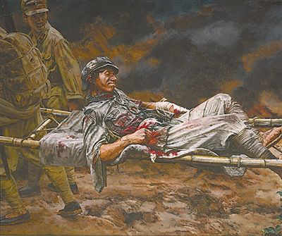 这幅油画中的主人公是陈树湘,油画上方写着的“为苏维埃流尽最后一滴血”,是他的真实写照,也是他率领的红34师的真实写照。