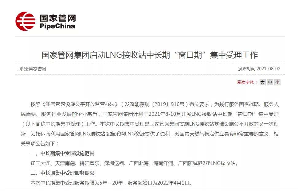按照《油气管网设施公平开放监管办法》(发改能源规〔2019916号)有关要求,为践行服务国家战略、服务人民需要、服务行业发展的企业宗旨,国家管网集团计划于20218-10月开展LNG接收站中长期“窗口期”集中受理(以下简称中长期集中受理)工作。本次中长期集中受理是国家管网集团实施LNG接收站基础设施公平开放的又一次创新,为托运商利用国家管网LNG接收站设施采购LNG资源提供了便利,对国内天然气稳定供应具有非常重要的意义。相关事项公告如下: